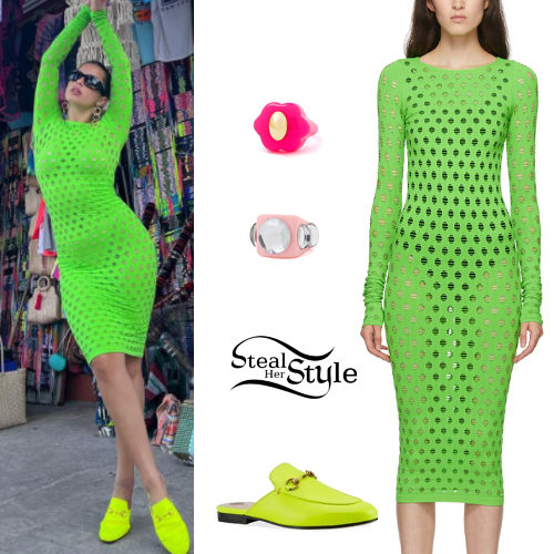 Addison Rae serves high-fashion vacation energy in a vibrant Maisie Wilen perforated midi dress. She perfectly coordinates the eye-popping green look with neon Gucci Horsebit leather slippers and chunky La Manso statement rings.
