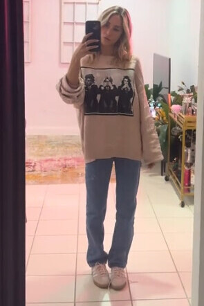 Alix Earle layers up for a cozy day in a neutral graphic long-sleeve sweatshirt paired with classic blue straight-leg jeans. Her effortless street style is finished with comfortable pink platform sneakers for a balanced, everyday aesthetic.