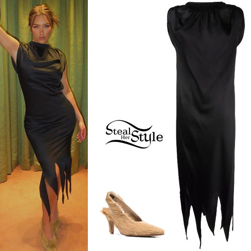 Anastasia Karanikolaou makes a bold fashion statement in a black raw-cut open-back draped dress featuring a unique jagged hemline. She pairs the avant-garde silhouette with tan furry slingback pumps for a tactile and edgy evening look. This ensemble perfectly blends minimalist color with high-fashion textures.