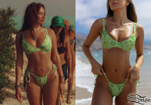 Anastasia Karanikolaou enjoys a sun-drenched beach day wearing a vibrant green floral bikini. The ensemble features the Jocelyn Top with supportive underwire and the matching Kendall Bottoms with adjustable side ties for a classic summer look.