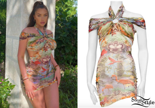 Anastasia Karanikolaou poses in a striking vintage-inspired Jean Paul Gaultier flamingo print mesh mini dress while on a tropical getaway. The dress features a complex halter-neck silhouette with cut-out detailing and vibrant scenic graphics, embodying the perfect luxury vacation aesthetic. This look highlights her bold style through high-fashion archival pieces.