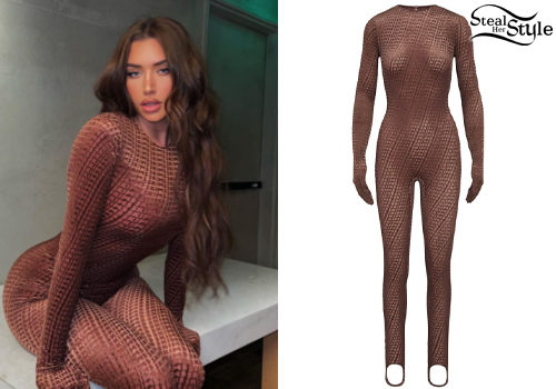 Anastasia Karanikolaou strikes a pose in a sleek SKIMS Velvet Stirrup Onesie in a rich chocolate brown hue. This body-hugging jumpsuit features a sophisticated textured velvet finish and classic stirrup detailing for a polished, avant-garde look. Perfect for a bold indoor shoot, the outfit highlights her signature glamorous style.