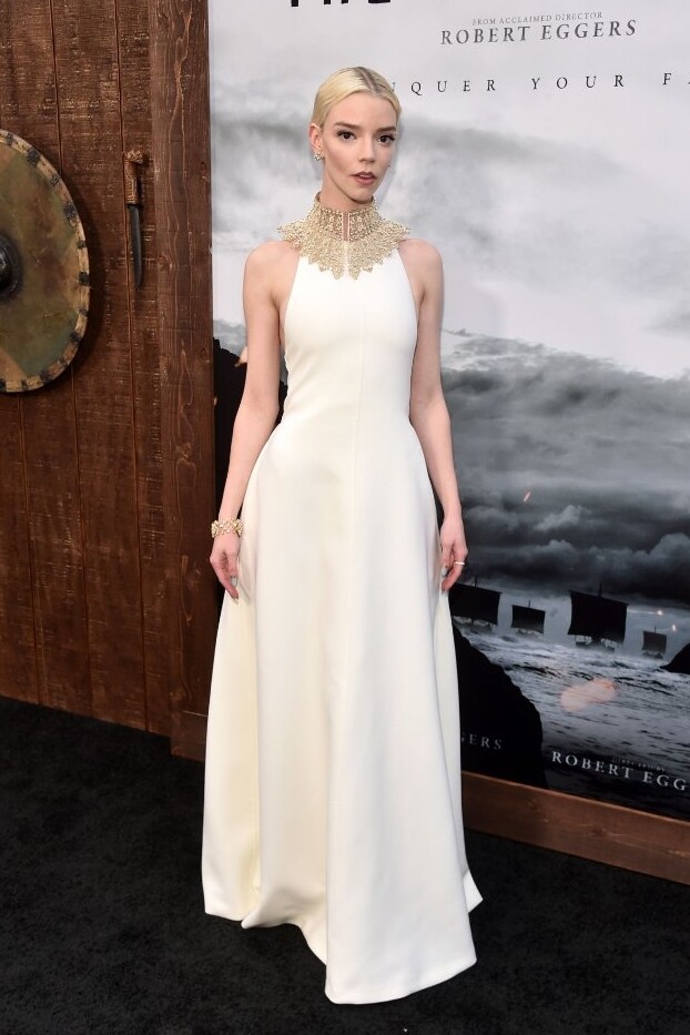 Anya Taylor-Joy embodies ethereal elegance at The Northman premiere in a floor-length white Dior Fall 2022 gown. The minimalist silhouette is elevated by an intricate gold lace collar and shimmering Tiffany & Co. Schlumberger jewelry. This regal look perfectly balances modern bridal inspiration with a medieval-chic aesthetic.
