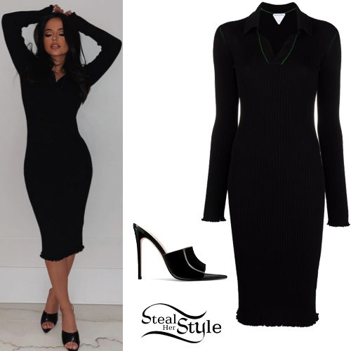 Becky G keeps it sleek and sophisticated in a black Bottega Veneta long-sleeve ribbed-knit dress featuring a classic polo collar. She completes the monochromatic ensemble with pointed-toe Femme Gianni patent mules for a touch of modern glamour. This look perfectly balances textured knitwear with high-shine accessories.