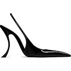 Bella Hadid commands the runway in a striking royal blue Saint Laurent guipure lace dress with structured shoulders. She accessorized the semi-sheer look with a bold crystal pyramid necklace and elegant black patent leather slingback pumps.