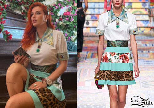 Bella Thorne elevates eclectic style wearing a Dolce & Gabbana patchwork ensemble featuring a crisp white polo top with an ornate brocade collar. The statement look is paired with a vibrant mini skirt that expertly blends floral motifs, animal prints, and turquoise banding for a high-fashion finish. This bold aesthetic showcases the star's penchant for maximalist, designer streetwear.