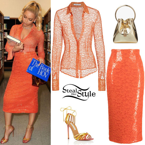 Beyoncé makes a bold monochromatic statement in an orange collared floral lace top paired with a matching sequinned lace midi skirt. She elevates the vibrant look with gold Jimmy Choo Bon Bon metallic bag and strappy Aquazzura sandals for a sophisticated, high-fashion aesthetic.