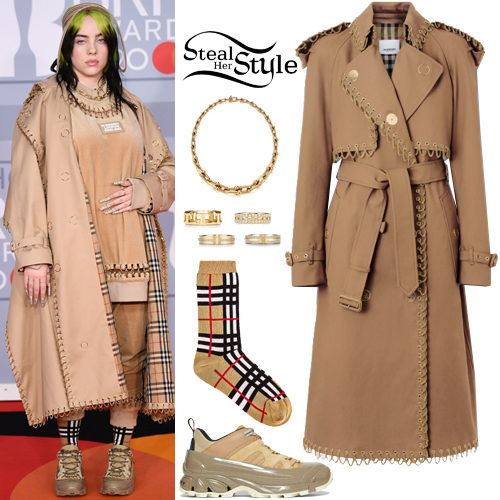 Billie Eilish makes a bold statement at the 2020 BRIT Awards in a head-to-toe Burberry ensemble featuring a unique chain-link detailed trench coat. She completes the oversized aesthetic with iconic checked socks, Arthur low-top sneakers, and layered gold Tiffany & Co. jewelry.