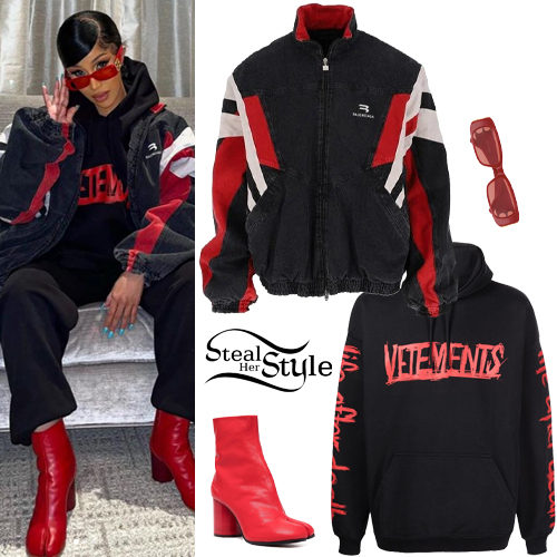 Cardi B serves a high-fashion streetwear look featuring a Balenciaga Denim Track Jacket layered over a Vetements World Tour Logo Hoodie. The outfit is punctuated by bold red accents, including Maison Margiela Tabi ankle boots and tinted rectangular sunglasses for a signature edgy aesthetic.