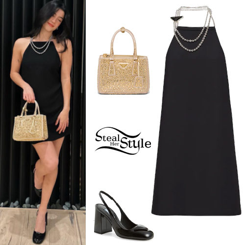 Charli D'Amelio showcases a sophisticated evening look featuring a Prada cady mini dress with a statement jewel halter neckline. She pairs the classic black silhouette with a glittering crystal-embellished Galleria mini-bag and sleek patent leather slingback pumps for a modern touch. This ensemble perfectly balances timeless elegance with high-fashion sparkle.