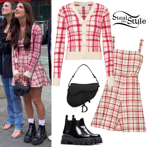 Charli D'Amelio showcases a preppy-meets-edgy aesthetic in a coordinated Red Check’n’Dior Pop dress and cardigan. She grounds the feminine plaid set with chunky Prada Monolith platform boots and a sleek matte black Dior Saddle Bag for an effortlessly cool street style look.