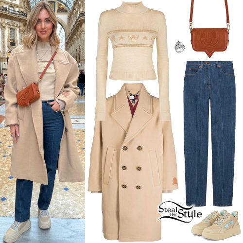 Chiara Ferragni showcases effortless street style in a chic Tommy Hilfiger double-breasted coat layered over a Logomania lurex sweater. She pairs the neutral tones with Gucci straight-leg denim and matching platform sneakers for a polished winter look. The ensemble is completed with a signature suede-effect crossbody bag in a warm camel hue.
