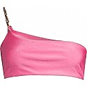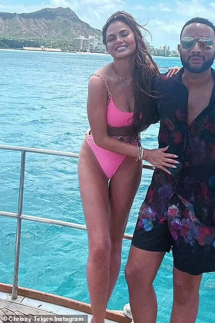 Chrissy Teigen poses on a boat during a tropical vacation, wearing a stunning pink Cult Gaia Jianna bikini set. The vibrant two-piece features unique chain-link straps and a belted high-cut bottom that perfectly complements her sun-kissed look.