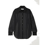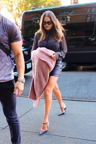 Chrissy Teigen showcases a sophisticated yet edgy street style look while out in New York City. She pairs a sheer polka-dot georgette shirt from The Frankie Shop with a sleek Khaite leather mini skirt and pointed-toe Saint Laurent pumps.