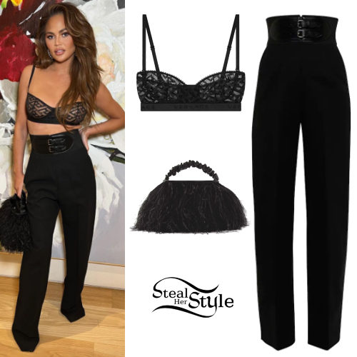 Chrissy Teigen makes a bold statement in a black Versace La Greca tulle bralette paired with structural Alaïa leather-trimmed high-rise pants. She elevates the evening look with a texture-rich Alexander Wang feather-embellished mini tote. This monochromatic ensemble perfectly balances edgy lingerie-inspired style with sophisticated tailoring.