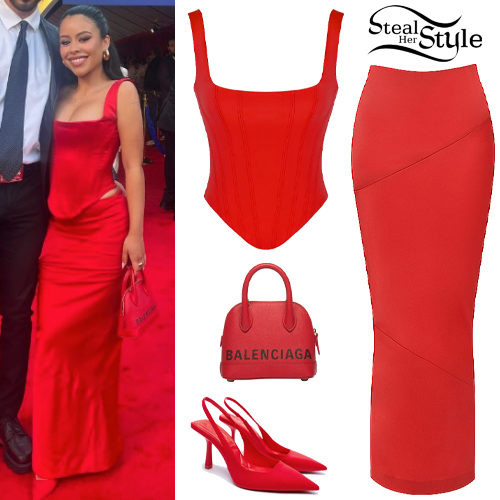 Cierra Ramirez stuns in a monochromatic vibrant red ensemble featuring a Rafa satin longline corset top paired with a matching low-waist midi skirt. She accessorized the bold look with red Zara slingback heels and a petite Balenciaga Ville top handle bag for a sophisticated red carpet appearance.