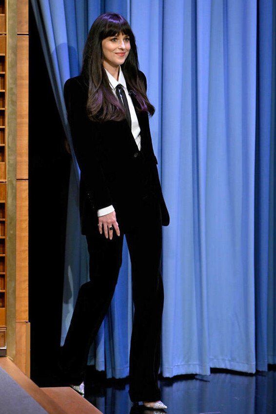 Dakota Johnson exudes effortless sophistication in a velvet Saint Laurent suit for her appearance on The Tonight Show. The ensemble features a crisp white cotton poplin shirt and a sleek silk georgette lavallière necktie, blending masculine tailoring with high-fashion glamour. The plush velvet texture and flared silhouette create a timeless, power-dressing aesthetic.