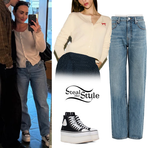 Demi Lovato keeps it effortlessly cool in a Reformation Clara Cashmere Crew Cardigan featuring a subtle red bow detail. This casual look is anchored by light-wash Alexander Wang straight-leg jeans and statement R13 Courtney platform high-top sneakers. It is the perfect blend of cozy knitwear and edgy street-style aesthetics.