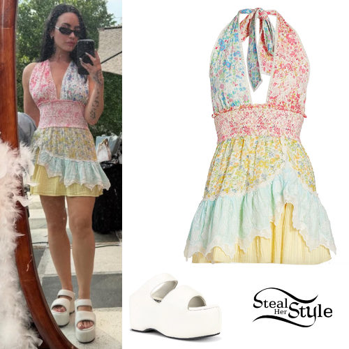Demi Lovato showcases a playful summer aesthetic in a LoveShackFancy Cambria halter dress, featuring a colorful floral patchwork design. She anchors the feminine, tiered mini dress with chunky Simon Miller platform sandals for a modern twist. This mirror selfie captures a perfect blend of bohemian charm and bold, contemporary footwear.