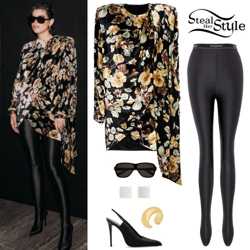 Dixie D'Amelio makes a bold fashion statement in a Saint Laurent ensemble featuring a draped floral velvet dress paired with high-shine jersey tights. She completes the avant-garde look with black slingback pumps, oversized square sunglasses, and gold-tone accessories for a sophisticated yet edgy finish.