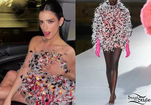 Dixie D'Amelio makes a bold statement at the MET Gala after-party wearing a striking feathered creation from Valentino's Fall 2021 Haute Couture collection. The voluminous mini dress features a vibrant mix of white, red, and black feathers that create a textured, avant-garde silhouette perfect for a high-fashion celebration.