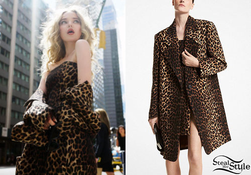 Dove Cameron exudes high-fashion energy in a bold monochromatic leopard print ensemble for a city-based editorial shoot. She layers a sharp tailored chesterfield coat over a matching strapless wool dress, creating a seamless and sophisticated animal print look.