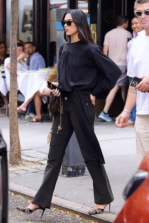 Dua Lipa showcases a sophisticated street style look in NYC, pairing a textured black tie-waist blouse with Chrome Hearts Fleur Knee Jeans. The monochromatic base is perfectly accented by leopard-print Manolo Blahnik pumps and a suede Chloe crossbody bag. Sleek Tom Ford sunglasses and Jenny Bird jewelry complete this elevated urban ensemble.