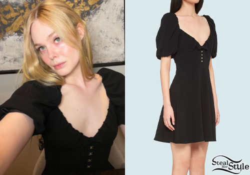 Elle Fanning exudes effortless charm in a chic Miu Miu Cady dress. This mini dress features romantic puff sleeves, a gathered sweetheart neckline, and elegant crystal-embellished buttons that elevate the classic black silhouette. The look perfectly balances vintage-inspired feminine details with a modern, sophisticated edge.