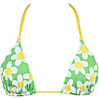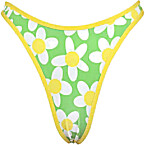 Elsa Hosk poses in a vibrant green and yellow daisy print bikini from her collaboration with Heavy Manners. The retro-inspired set features a double string triangle top and high-cut thong bottoms, perfect for a sun-drenched day by the ocean.