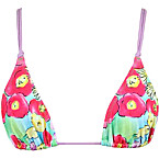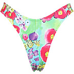 Elsa Hosk exudes effortless vacation vibes in a colorful floral Heavy Manners bikini paired with a purple oversized button-up shirt. The look is elevated with vintage gold clip-on earrings for a chic, retro-inspired poolside aesthetic.