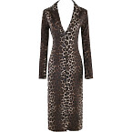 Elsa Hosk embraces a bold aesthetic for the I.Am.Gia Office Collection launch. She pairs the animal-print Uma Coat with the matching Remini Skort 2.0 for a high-fashion take on professional attire. The look is completed with sheer black hosiery and a sleek, pull-back hairstyle.
