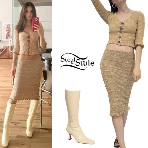 Emily Ratajkowski masters monochromatic textures in a sand-colored coordinate set. She pairs a ruffled, button-up knit cardigan with a matching textured pencil skirt and off-white Manu Atelier square-toe boots for a chic, modern aesthetic.