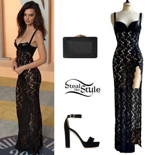 Emily Ratajkowski makes a stunning statement in a sheer black lace floor-length gown featuring a dramatic thigh-high slit and corset bodice. She perfectly accessorized the look with sleek platform suede sandals and a geometric satin clutch for a high-fashion evening ensemble.