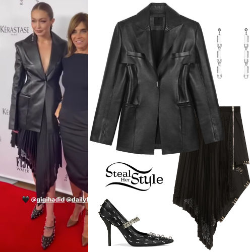 Gigi Hadid exudes edgy elegance in a head-to-toe Givenchy ensemble featuring a graphic cut leather jacket and an asymmetrical pleated skirt with metallic details. She completes the look with spiked leather pumps and crystal G-link earrings for a modern, high-fashion red carpet statement.