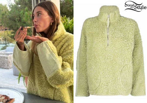 Hailey Bieber showcases effortless off-duty style while enjoying a relaxing moment outdoors. She is seen wearing a cozy Acne Studios textured oversized fleece in a vibrant lime green hue, featuring a comfortable half-zip neckline and sporty paneling.