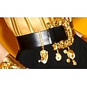 Hailey Bieber showcases high-fashion elegance in a full Schiaparelli ensemble at the OBB Studios launch. The look features a structured black bustier top paired with intricate jacquard cigarette pants and an oversized ornate gold belt.