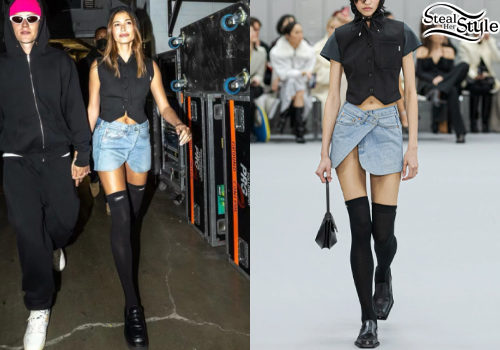 Hailey Bieber serves a masterclass in edgy street style, pairing a cropped black vest with a unique asymmetric denim skirt from Coperni's Fall 2022 collection. She completes the look with over-the-knee black socks and chunky loafers for a modern, preppy twist. This ensemble perfectly blends high-fashion runway pieces with a casual, cool-girl aesthetic.