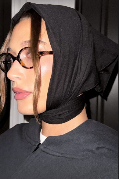 Hailey Bieber showcases a sophisticated casual look featuring tortoiseshell Miu Miu oval optical glasses paired with a chic black headscarf. This modern take on vintage eyewear highlights her effortless street style and signature accessory curation.