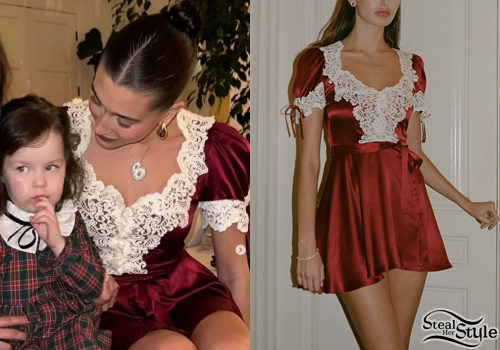 Hailey Bieber celebrates the holiday season in a festive Mirror Palais Unwrap Me Mini Dress in Garnet. The silk satin piece features vintage-inspired white lace trim, puff sleeves, and a delicate bow-tie waist for a romantic evening aesthetic. She completes the look with her signature sleek bun and gold statement jewelry.