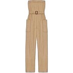 Hailey Bieber showcases an effortless utilitarian chic in an editorial shoot wearing a Saint Laurent strapless jumpsuit in cotton gabardine. The sand-colored one-piece features a belted waist and wide-leg silhouette, accessorized with bold gold-tone jewelry and a black leather shoulder bag.