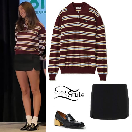 Hailey Baldwin strikes a perfect balance between preppy and edgy in this Miu Miu striped knit polo paired with a black vented miniskirt. She completes the academic-inspired look with white socks and statement Dries Van Noten metallic-heeled penny loafers for a modern twist.