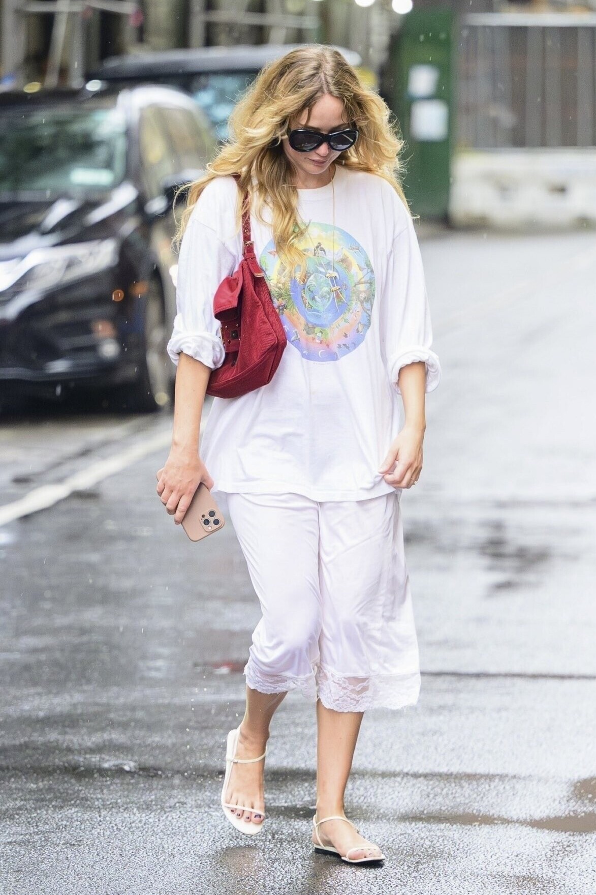 Jennifer Lawrence showcases an effortless street style look in New York City, blending vintage and luxury. She pairs a 1994 Earth Day graphic shirt with delicate lace-trimmed white trousers, finished with a burgundy corduroy Fendi Mamma Baguette and minimalist The Row sandals.