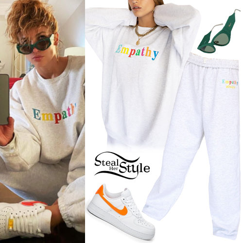 Jennifer Lopez keeps it cozy in a grey lounge set featuring 'Empathy Always' rainbow embroidery. She pairs the relaxed Mayfair Group tracksuit with bold green Salvatore Ferragamo sunglasses and classic Nike Air Force 1 sneakers for an elevated off-duty look.