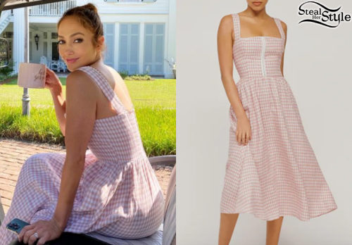 Jennifer Lopez looks effortless in this pink gingham Reformation Tagliatelle Linen Dress. The cottagecore-inspired piece features a fitted bodice and a romantic flared skirt, perfect for a chic casual afternoon. Her relaxed updo and minimal accessories complete this feminine and breezy look.