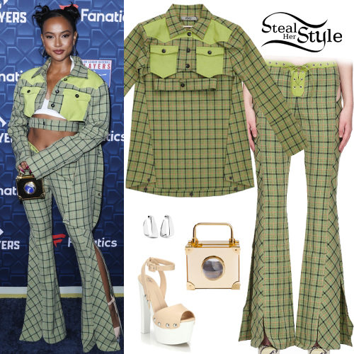 Karrueche Tran makes a bold statement in a green plaid patchwork set featuring a cropped jacket and lace-up flared trousers. She accessorizes the unique look with Jennifer Fisher chunky silver hoop earrings and tower-high platform sandals. The ensemble is anchored by a quirky gold box purse for a playfully edgy red carpet finish.