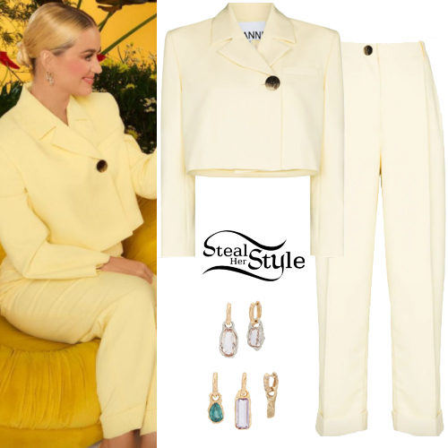Katy Perry serves sophisticated charm in a pale yellow Ganni suit featuring a cropped blazer and matching darted wide-leg trousers. She elevates the soft, pastel aesthetic with a curated selection of delicate gold and gemstone charm earrings for a polished finish. This modern take on power dressing perfectly balances structure with a feminine color palette.