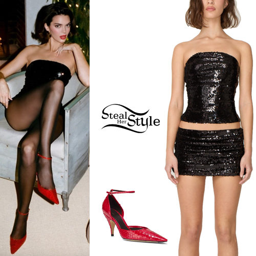 Kendall Jenner radiates glamour in a shimmering black sequin corset-style tube top and matching micro mini skirt for a festive look. She adds a bold pop of color with red python d'Orsay pumps, perfectly balancing the monochromatic sparkle. This high-octane ensemble is finished with sheer black tights for a sophisticated party aesthetic.