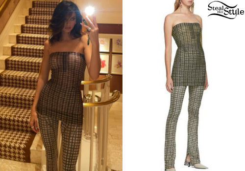 Kendall Jenner showcases a modern, monochromatic silhouette in this matching green checked ensemble. The outfit features a sleek strapless tube top layered over coordinating slit-hem leggings for a cohesive, chic aesthetic.