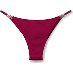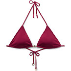 Kendall Jenner stars in the Calzedonia campaign wearing a minimalist plum-colored bikini set. The look features a classic triangle top paired with matching Brazilian-cut bottoms, perfect for a chic summer vacation aesthetic.