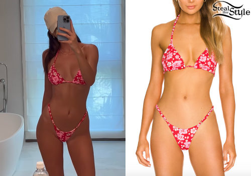 Kendall Jenner showcases a classic summer look in this vibrant red floral print bikini. The ensemble features a timeless triangle top paired with matching high-cut bottoms, perfect for a poolside or beach day aesthetic.